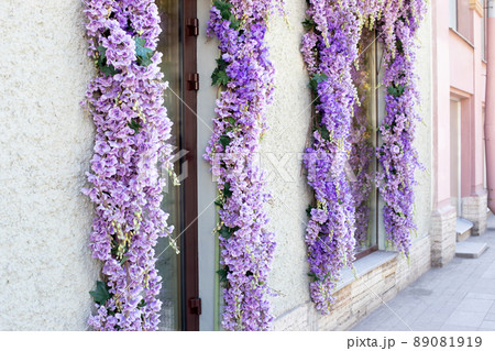 Decoration with purple decorative artificial Delphinium flowers over an entrance of store and shop windows. Vintage exterior