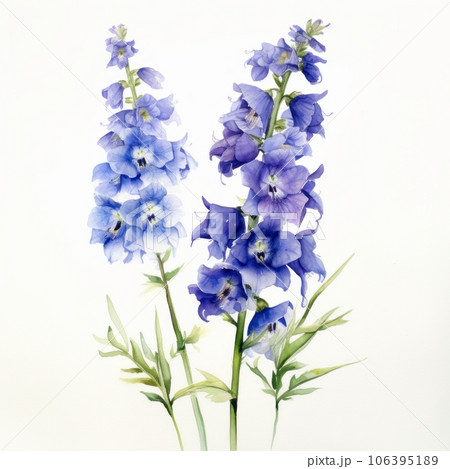 Blue watercolour delphinium larkspur spring summer flower illustration on white backdrop. Generative AI