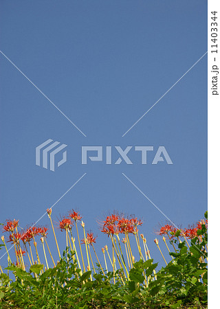 鮮やかに彼岸花が咲く秋の風景と秋空のコピースペース