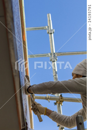 Against crane. With wooden plank. Man is working on the construction site at daytime