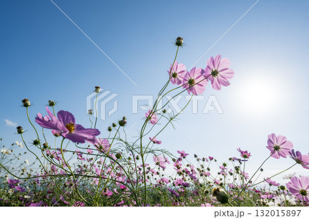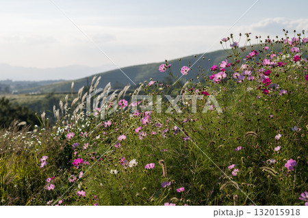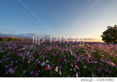 秋の花コスモスが咲き誇る夕暮れに映える色とりどりの秋桜