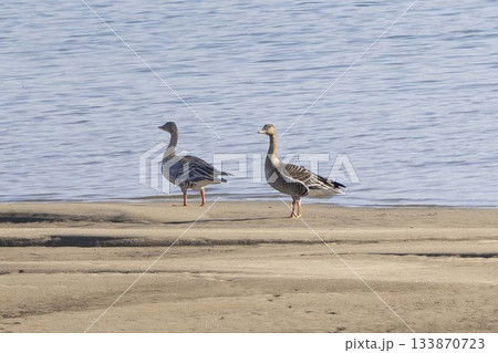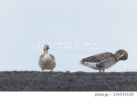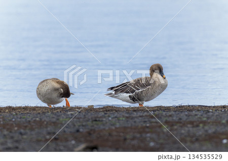 湖畔で羽を休めるヒシクイ