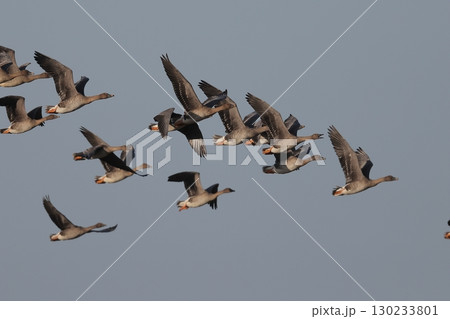 飛翔するヒシクイの群(北海道・鶴居村)