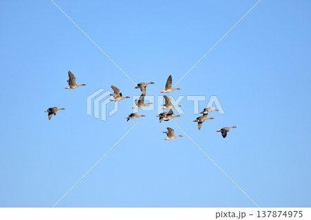 飛翔するヒシクイの群れ