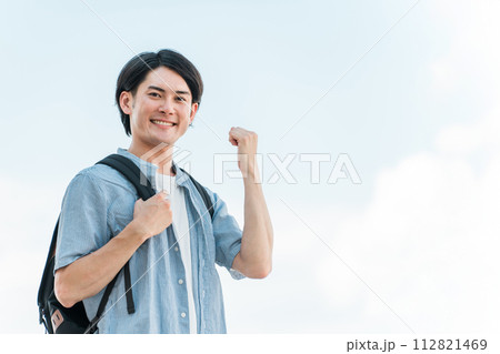 青空の下にいる笑顔の学生・大学生の男性(進学・受験・チャレンジ・希望・目標)