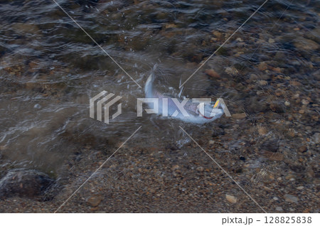 Splashes from the waves bumping against the rocky shore. Vertical photo