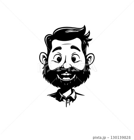 Monochrome cartoon illustration of a bearded man with happy expression, stylized drawing