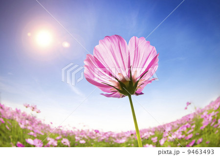 Low angle view of isolated pink cosmos flowers against blue sky, Thailand