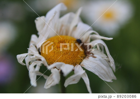 wilted chamomile flower with crawling ant view from above. Collection of medical herbs autumn passing life aging
