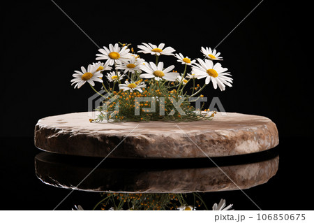 Beautiful spring background with white daisy flowers and empty wooden table in nature outdoor. Natural template with sunlight.