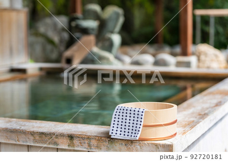 湯船と風呂桶 日本の温泉 露天風呂 和風イメージ