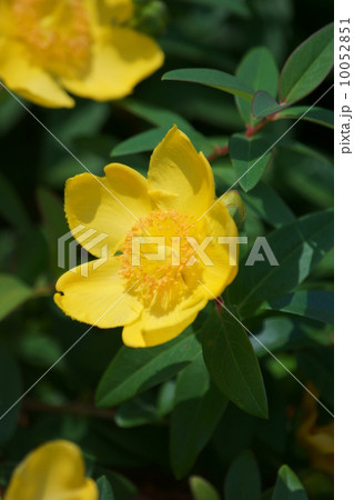 ヒペリカムの花のクローズアップ(日かげに咲いた金糸梅の黄色い花)