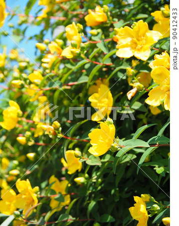 満開のヒペリクム・ヒドコート(大輪金糸梅)と青空