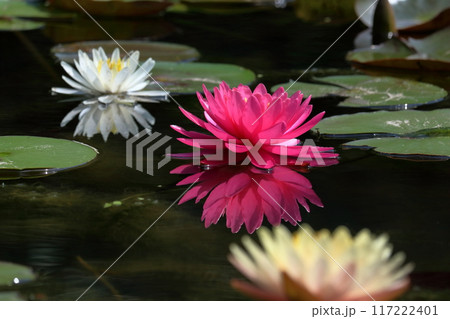 夏の水面を彩る紅白のスイレン (高知県 三原村)