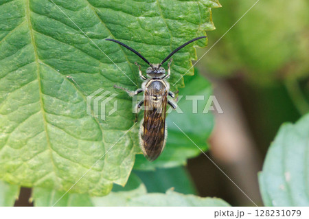 ホトトギスの葉の上のヒメハラナガツチバチ