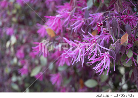 ベニバナトキワマンサクのひも状のピンク花をクローズアップ/埼玉県・4月