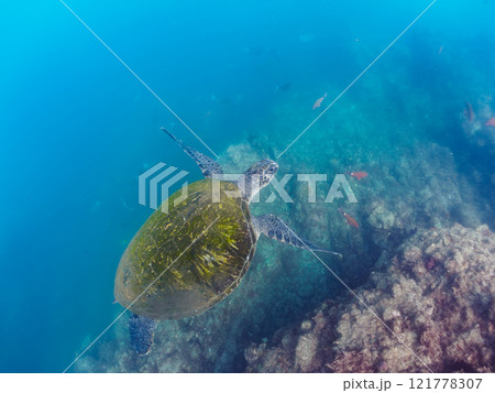 ゆったり泳ぐ美しく大きなアオウミガメ(ウミガメ科)。静岡県伊豆半島賀茂郡南伊豆町中木ヒリゾ浜2024