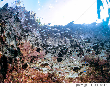 水中洞窟にいる、美しいミナミハタンポ、クロホシイシモチ他の幼魚の群れ, 伊豆賀茂郡南伊豆町中木ヒリゾ