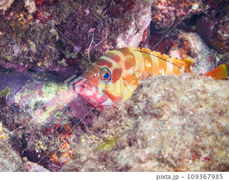ヒリゾ浜の水中洞窟にいる美しいアカハタ(ハタ科)。 静岡県伊豆半島賀茂郡南伊豆町中木から渡し船で渡