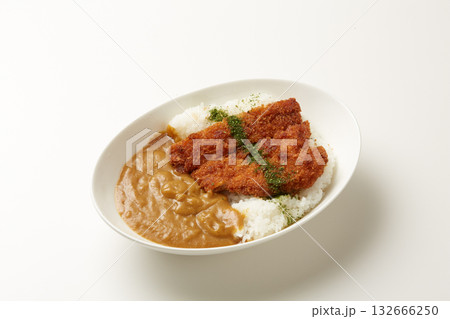 大きい豚カツが真ん中に一枚乗っているカツカレーを白背景で撮影