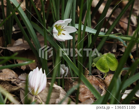 早春丹場篠山で見られた葉に白色の筋が入り白色の花弁に黄色の雄しべが綺麗なヒロハノアマナ