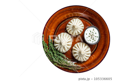 Khinkali Dumplings with beef and lamb meat on rustic plate with herbs. High quality Isolate, white background.