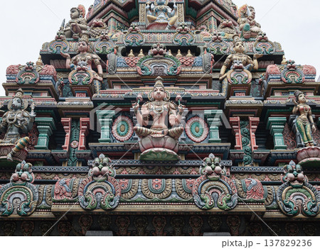 This image shows the vibrant, intricately carved gopuram of the Sri Maha Mariamman Temple. A central statue of Goddess Lakshmi is surrounded by tiered rows of deities and floral motifs, showcasing