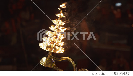 Varanasi, India. Man makes movements with a candle holder with lit candles on the Ganga Maha Aarti ceremony begins. Brahman priest wearing red and yellow dress doing traditional ganga aarti at ghat