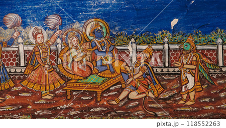 Old-painted Walls. Frescoes On Wall Of Hanuman Temple In Jaipur, India. Religious Motifs From Life Of Hanuman Are Painted. Monkey-like Deity, Son Of Wind God Vayu. Hanuman Also Known As Maruti