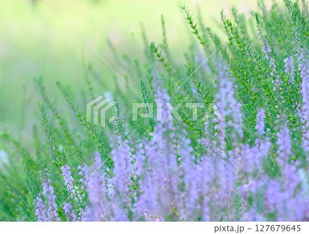 満開ヘザーと緑の清涼感溢れる風景