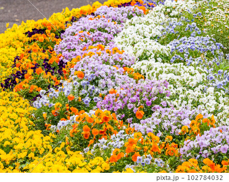 春の美しい景色 カラフルな満開の花壇