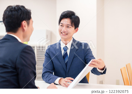 窓口で来客の対応をするビジネスマン