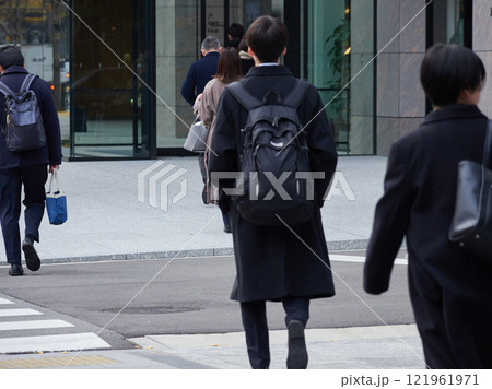 冬の大都市のビジネス街で歩く通勤中の男女会社員の姿