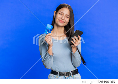 Woman use credit bank card smartphone while transferring spending money, purchases online shopping