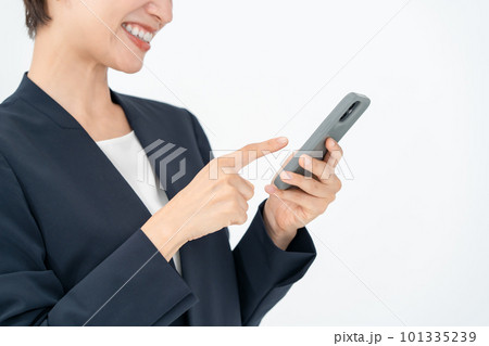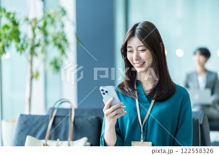 オフィス街でスマホを操作するオフィスカジュアルの若いビジネスウーマン