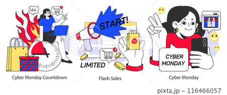 E-commerce set. Online shopping with a big discount and special offer. Promotion campaign. Purchasing goods in mobile app or social media blog. Flat vector illustration