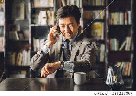 図書館,書斎で腕時計を確認するアジア人男性ビジネスマン(予定,スケジュール,時間)