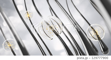 3d hair follicles and clear gel serum drops with gold oil bubbles. Liquid circle droplets of shampoo, honey mask, keratin, biotin vitamin. Cosmetic care background, beauty product ad. 3D illustration