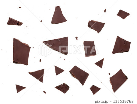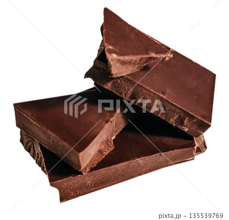 Dark chocolate pieces isolated on white background