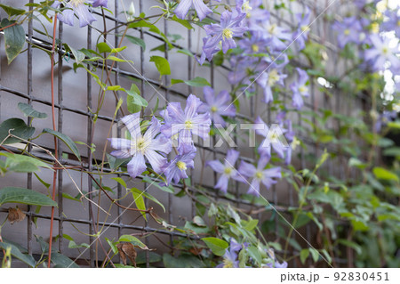 家のフェンスに誘引したクレマチス「プリンスチャールズ」の花