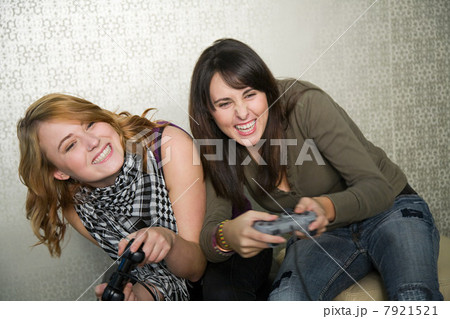 Teenage girls playing video game