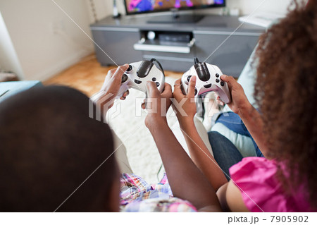 African twin sisters playing video games