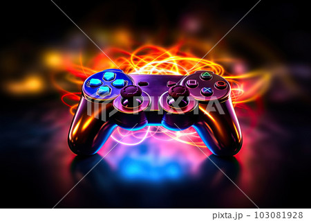 Video Game Controller Illuminated by Neon Light Streaks, created with Generative AI