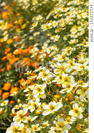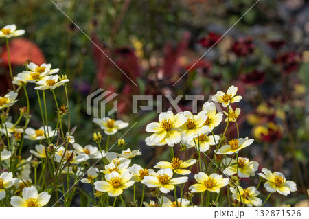 秋の公園に咲くウインターコスモス(ビデンス)の黄白色の花