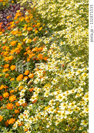 アリッサムの白い花壇に咲いた黄色いウィンターコスモス