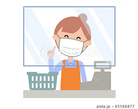 感染対策をしたスーパーのレジ でレジカゴバッグに商品を入れてもらう買い物客