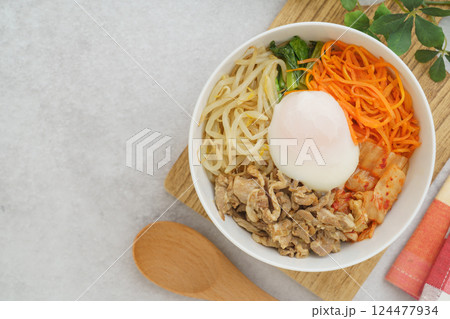 もやしナムルやキムチ、豚肉など沢山の具材が入っているビビンバ丼を俯瞰で撮影