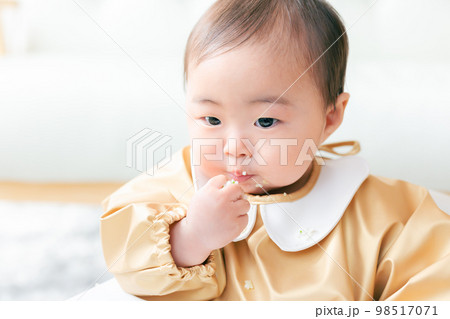 離乳食を手づかみ食べするカミカミ期の赤ちゃん コピースペース