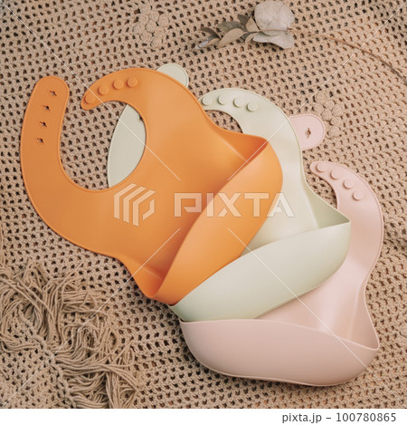 Three silicone baby bibs of different colors on beige blanket. Flat lay. Square frame, instagram use