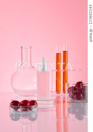 Several laboratory tools displayed on white background, which contains red cherry fruits. The blank label serum bottle placed in center for cosmetic product advertisement, blank space for text